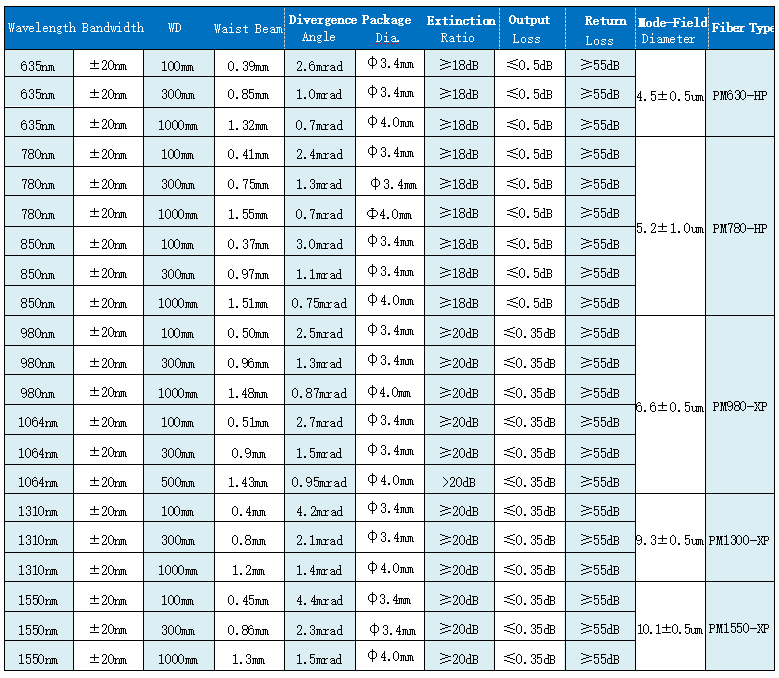 由保偏光纤尾纤和自聚焦透镜或C透镜精确定位封装而成,可将光纤传输出射光变成平行光束 (高斯光束),或将外界的平行光聚焦耦合进入光纤内。它可以单只使用,在要求位置达到指定尺 寸光斑;也可以配对使用,在一对准直器中间加入滤波片、隔离器等其它光学元件,达到客户使用 目的。在以光学相干检测为基础的干涉型光纤传感器中,使用保偏光纤能够保证线偏振方向不变,