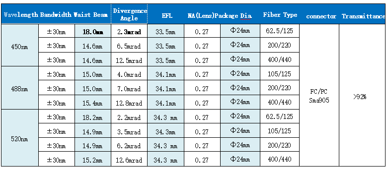 *光束远场发散角:输入选用各波长单模光纤,按高斯光束1/e2理论计算值。公差+0.003°/0.0°